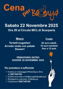 Carissime amiche, carissimi amici, sabato 22 novembre, alle 20 al Circolo Mcl Scarperia, si terrà la nostra annuale cena di beneficenza, protagonisti della serata i nostri fantastici tortelli freschissimi! C'è tempo fino a giovedì 20 novembre per prenotare, non aspettate però l'ultimo momento, mi raccomando! Vi aspettiamo come sempre numerosi!